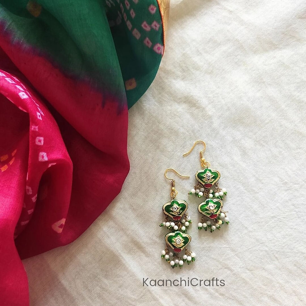 This festive handcrafted lac meenakari jewelry set in red, green and gold is adorned with pearls and glass beads, creating an exquisite choker that's a true work of art! Each piece requires the expertise of nine skilled craftsmen, resulting in a final product that is nothing short of stunning and gorgeous.